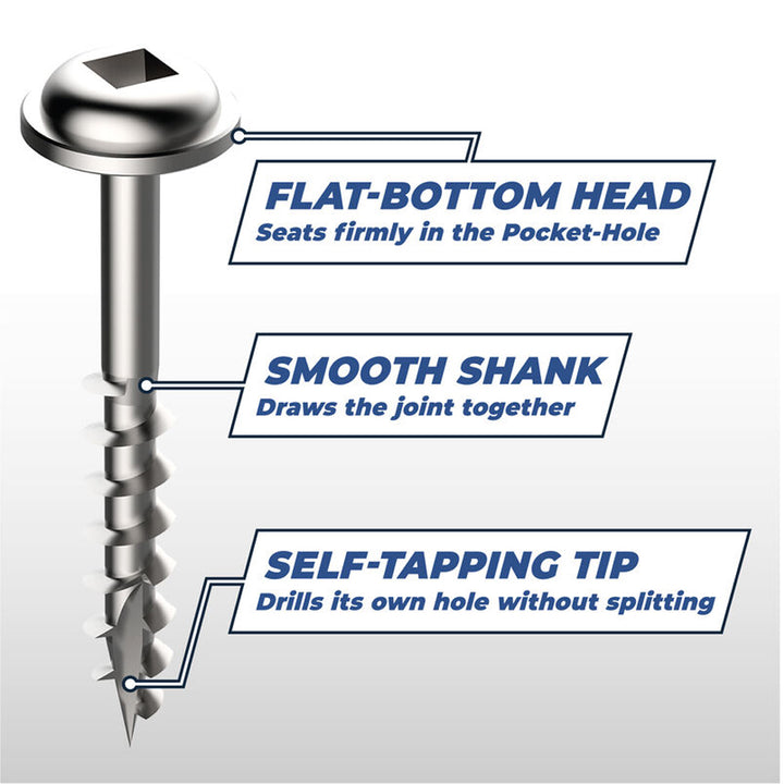 - The deep recess of the square drive provides positive driver engagement to reduce cam-out.They feature a self-tapping auger point that eliminates pre-drilling and a flat head that seats flushly in the bottom of the pocket hole.