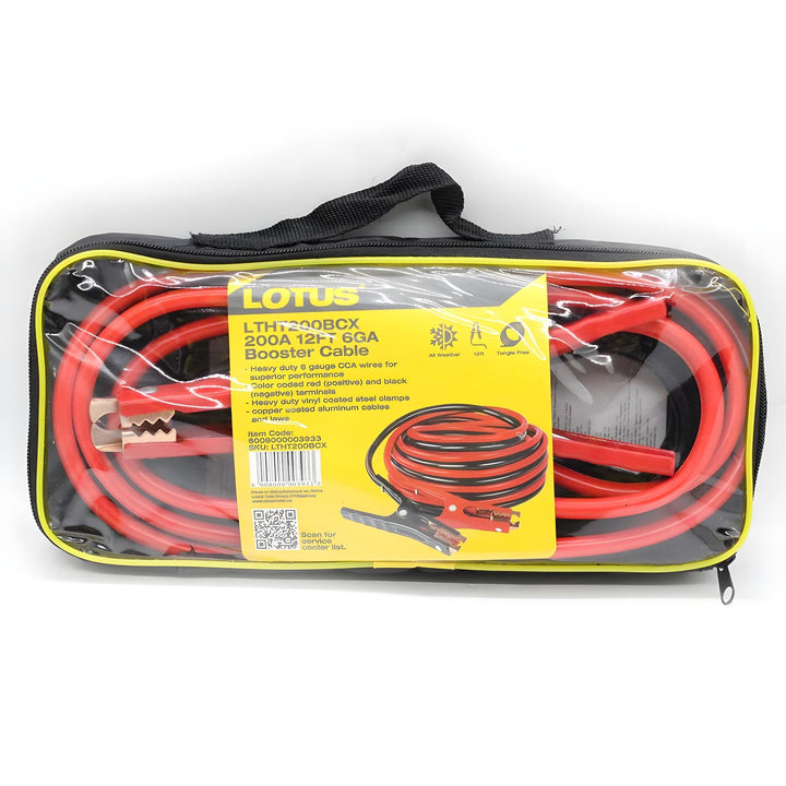 The Lotus Booster Cable 200A 12FT 6GA LTHT200BCX is a robust and reliable solution designed to provide powerful jump-starting capabilities for vehicles in need of an emergency boost. Featuring a 200-amp capacity, this booster cable is engineered to handle the demands of starting most standard vehicles, including cars, SUVs, and light trucks. Constructed with 6-gauge copper-clad aluminum wire, it ensures excellent conductivity and durability, delivering efficient power transfer over its 12-foot length for added flexibility and reach. The cables are insulated with heavy-duty, weather-resistant rubber, offering protection against abrasion, oil, and extreme temperatures, making them suitable for use in various conditions. Equipped with strong, color-coded clamps featuring reinforced jaws, the LTHT200BCX ensures a secure connection to battery terminals, enhancing safety and ease of use. Compact and portable, this booster cable comes with a convenient carrying bag, making it an essential tool for roadside emergencies or garage storage.