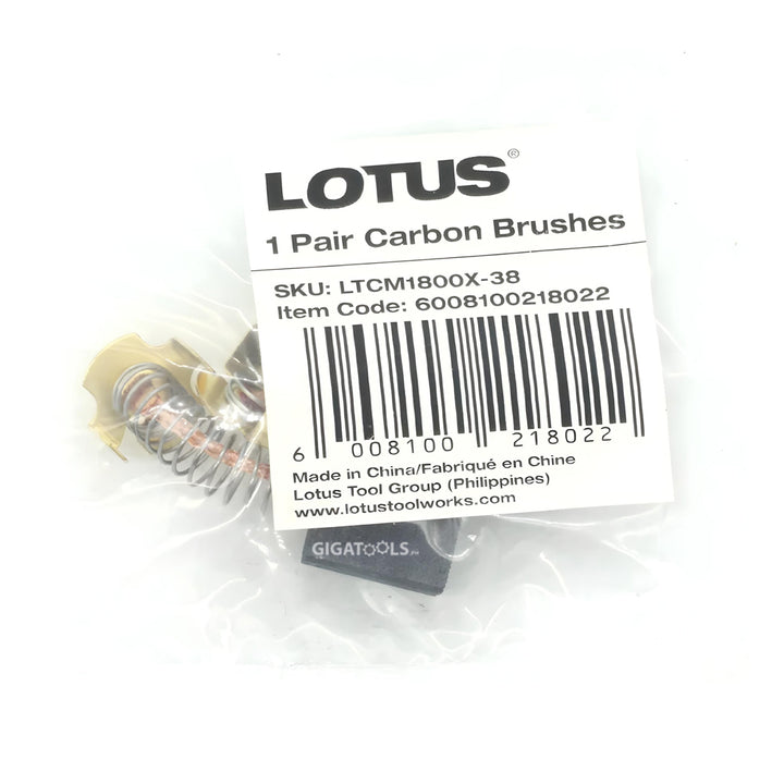The Lotus Carbon Brush LTCM1800X-38 is a high-quality replacement component designed for the Lotus Power Tools Series, offering exceptional performance for a wide range of power tool applications. This carbon brush is engineered for a long life, providing durable and reliable service with reduced wear over time. Its low spark design enhances safety by minimizing the risk of ignition during operation, making it suitable for both professional and home use. Built to be safe and reliable, it ensures consistent power delivery for various tasks. Additionally, the brush features anti-electromagnetic interference technology, delivering stable and efficient performance without disruptions. Packaged as a pair, this genuine Lotus spare part, proudly made by Lotus Tool Group (Philippines) and manufactured in China, comes with the SKU LTCM1800X-38 and item code 6008100218022, making it an essential addition for maintaining your power tools in top condition.