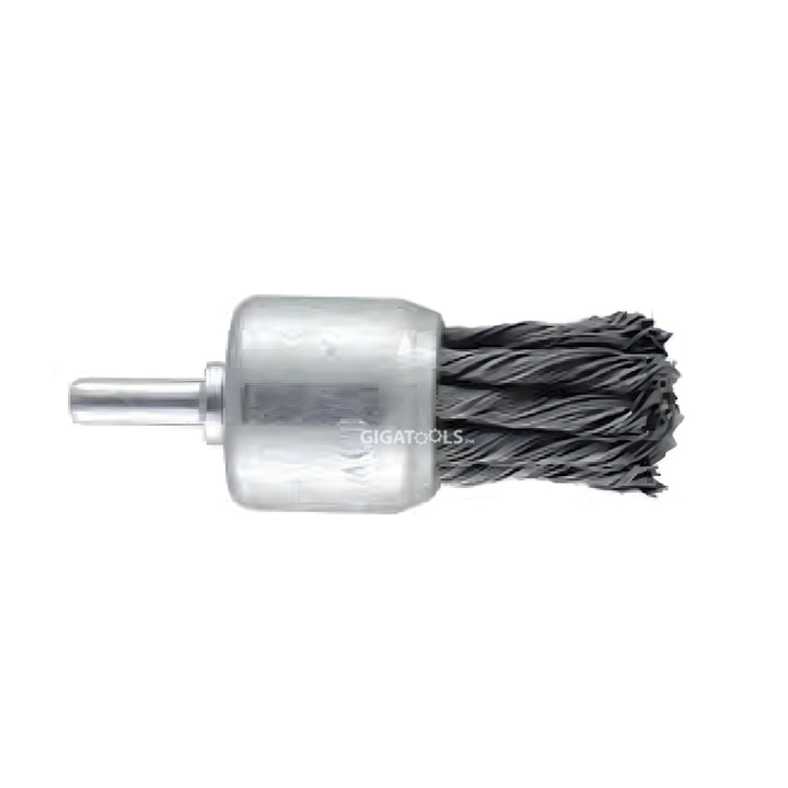 Its compact end-brush form allows access into corners, recesses, and tight spaces that larger brushes cannot reach. Equipped with a 1/4" shank, it is compatible with drills and die grinders, making it versatile for both workshop and on-site applications. The uniform knotted filaments provide consistent cutting performance while maintaining flexibility for light to medium-duty operations.