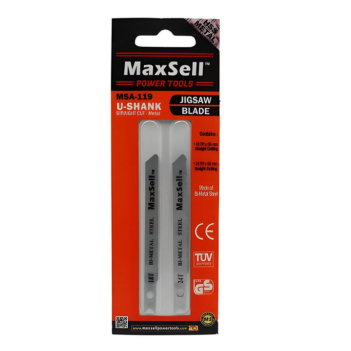 Maxsell MSA-119 Jigsaw Blades are engineered for cutting a variety of materials, including metal, with superior efficiency and precision. Constructed from high-quality bi-metal steel, these blades are known for their durability and resistance to wear. The U-shank design ensures a secure fit for most jigsaw models, delivering smooth and accurate cuts. Available in two specifications, these blades are ideal for cutting through metal with ease.