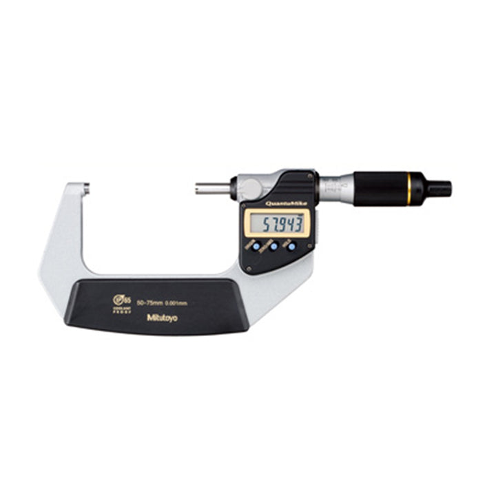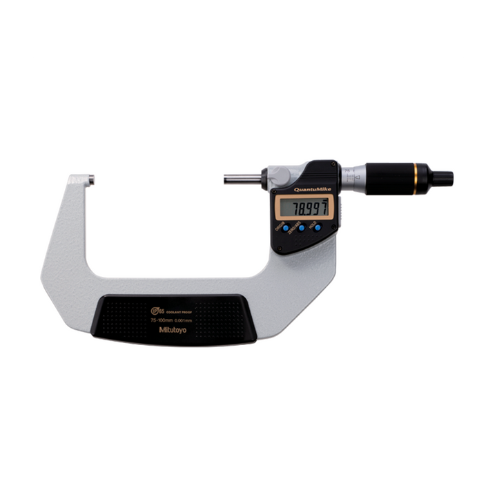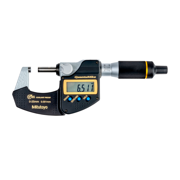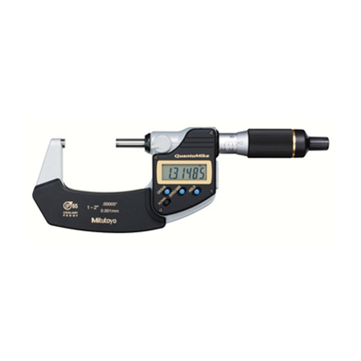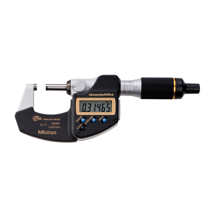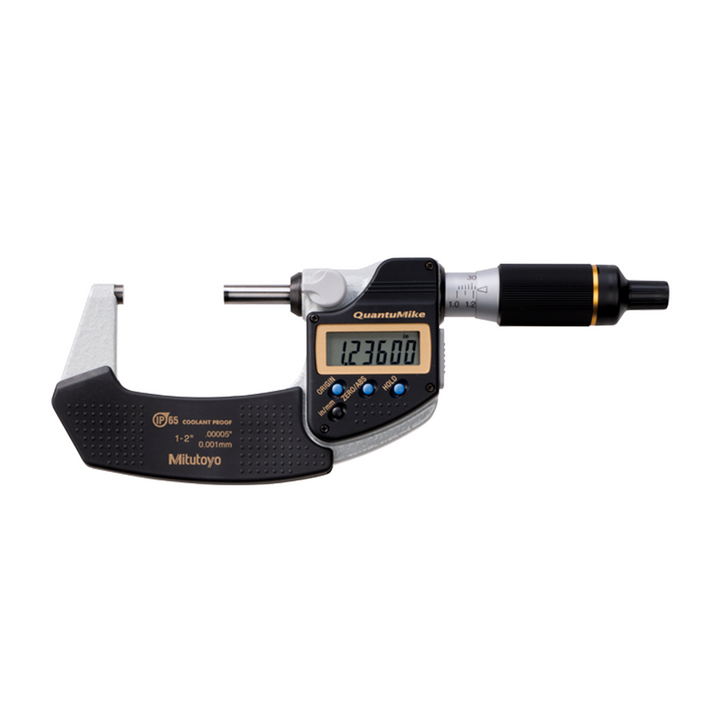 The Mitutoyo digital QuantuMike utilizes a courser spindle thread which feeds the spindle by 2mm per revolution of the thimble instead of the standard 0.5mm. The coolant-proof micrometer’s ratchet thimble mechanism provides a constant measuring force on the spindle to ensure accurate, repeatable measurements..