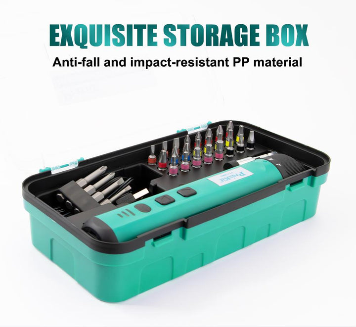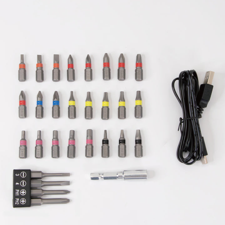 | Accessories | 25mm Bits 24pcs: ● PH1x2,PH2x2,PH3x2 ● 3,0,4,0,5,0 ● PZ1,PZ2 ● T10x1,T15x2,T20x2 ● 3,0x2,4,0x2,5,0x1 ● S0,S1,S2 50mm Bits 4pcs: ● 3,0,4,0 ● PH1,PH2 Magnetic Bits Holder (50mm) USB Type-C Cable |