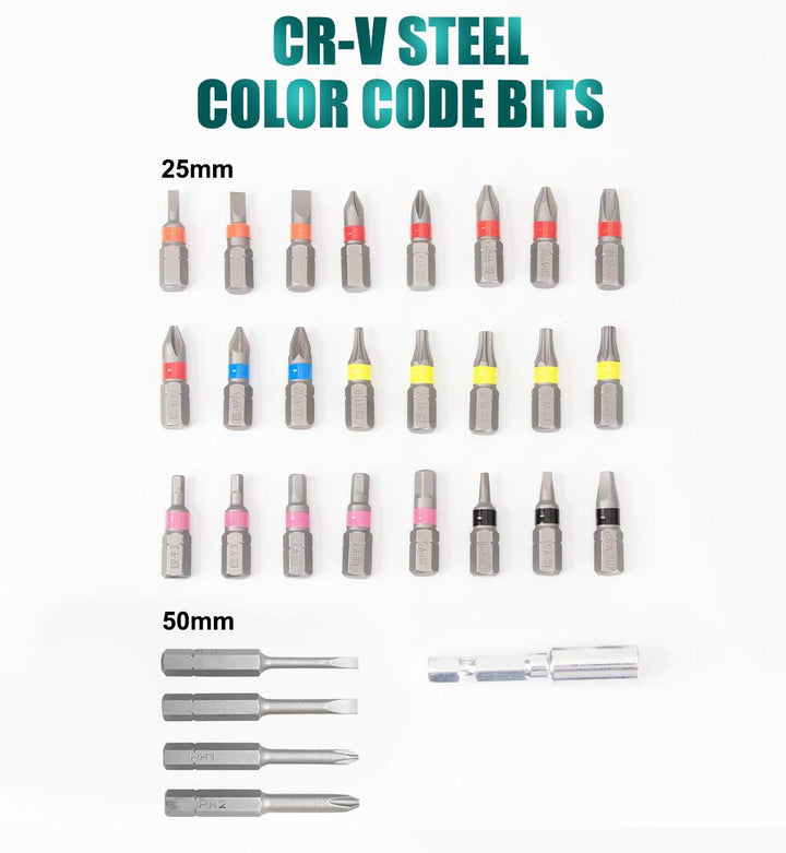 - Comprehensive Accessory Kit: Includes 28 CR-V steel bits, a magnetic bit holder, and a durable plastic storage box for organized storage.