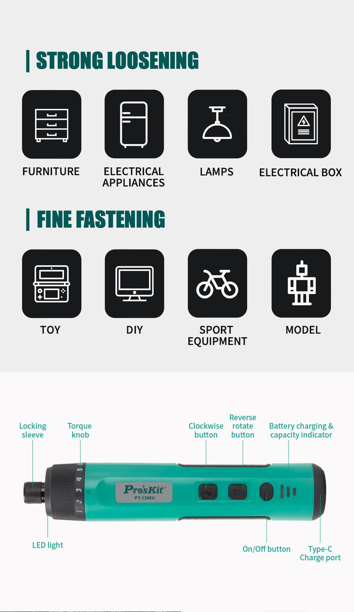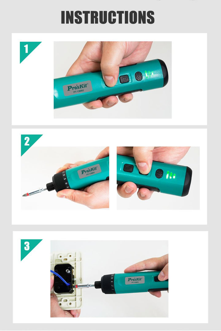 The Pro'sKit PT-1366U is a versatile and efficient cordless electric screwdriver designed to meet the demands of both professionals and DIY enthusiasts. With its compact design, adjustable torque settings, and comprehensive accessory kit, it ensures precision and convenience in various screwdriving tasks.